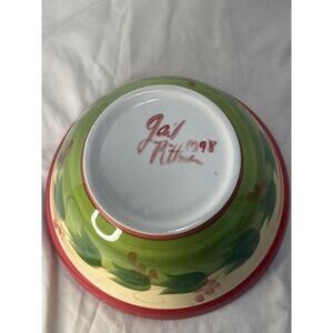 This signed Gail Pittman bowl set has a large serving bowl (approximately 8.25" in diameter and 4" tall) and a soup bowl that is 7.25" in diameter and 1.5" tall. The soup bowl has a tiny chip (it just looks like the coating flaked away in that spot) and appears to be in excellent shape. Please check out the photos for specific details about their condition.