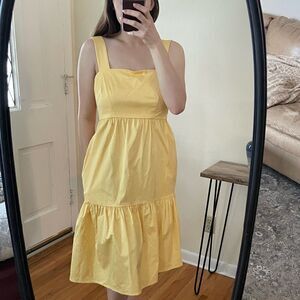 Features: sleeveless, thick tank shoulder straps, square neckline, bow back detail, hidden side zipper, lined, tiered, in yellow stretch cotton