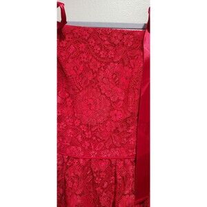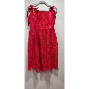 This Gal Meets Glam cocktail dress in CRANBERRY features a lace design with a square neckline and strappy sleeveless style. The Lucia Tie Shoulder dress in size US 10 has a fit & flare silhouette that falls to knee length, making it suitable for parties and cocktail events. The cotton blend fabric with a zip closure requires dry clean only. Perfect for all seasons, this elegant dress is a sophisticated addition to any woman's wardrobe.
