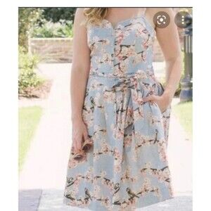 The Gal Meets Glam Daphne Dress in size 16 features a charming Cherry Blossom Birds pattern in pink, perfect for a party or cocktail occasion. This sleeveless dress has a sweetheart neckline and button closure, with pleated and bow accents adding a touch of elegance. Made of polyester with a cotton fabric type, this knee-length dress is designed for plus-sized women and includes pockets for added convenience. Perfect for summer and spring seasons, this fit and flare style dress from the GLAM brand is a lovely addition to any wardrobe. Button-down and snap closure- decorative sash.