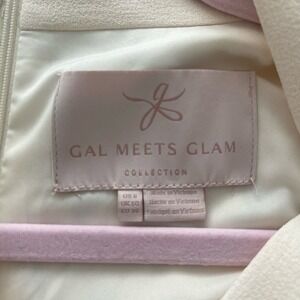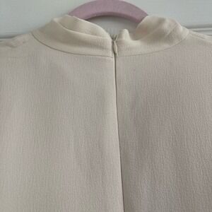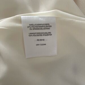 Gal Meets Glam Ines Tie Neck Long Sleeve Shift Dress in Cream, Size 6, Features a V-neckline with attached tie, long sleeves with two -button cuffs, gathered shoulders, crepe fabric, hidden back-zip closure, and lined. Style K0620M. 97% Polyester, 3% Spandex. Excellent Pre-owned condition
