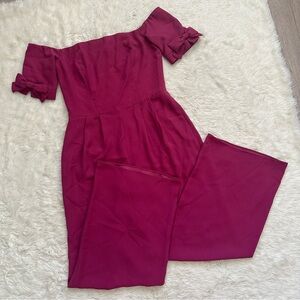 Gal Meets Glam Jumpsuit Meredith Crepe Off the Shoulder Wide Leg Bow Sleeves Pockets Petite Sz 6P