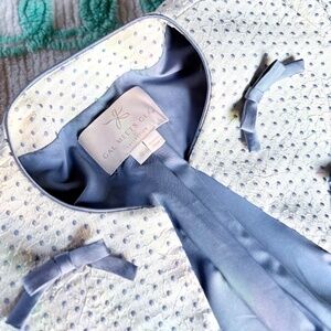 Timeless ivory and periwinkle polka dot jacquard jacket with a satin sky-blue lining and six grosgrain bows down the front. This cropped, structured silhouette channels classic coquette charm — the perfect “something blue” for bridal showers, weddings, or romantic soirées.