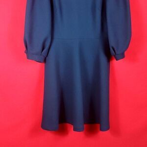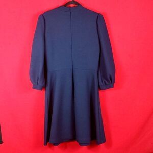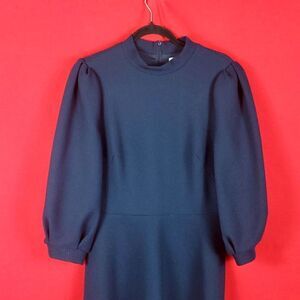 Maggie navy blue ribbed texture fit n flare dress. 3/4 puff sleeves. Mock neck. Concealed back zipper.
