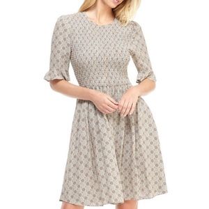 Chic and stylish dress with a multicolor pattern. Features short sleeves and a fitted bodice. Perfect for any occasion.