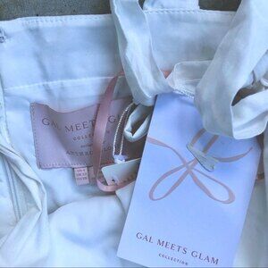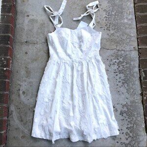 Gal Meets Glam Trudy Dress White Tonal Floral Applique Fit and Flare. Adjustable shoulder ties. Short mini length. Zipper in the back. Side pockets