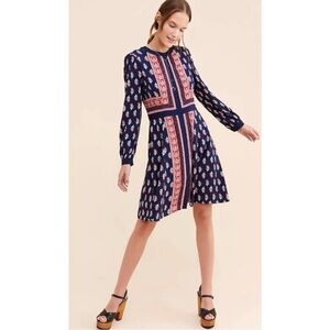 Gal Meets Glam Woodblock Print Midi Dress Size 0 Button Up Long Sleeve Blue Red