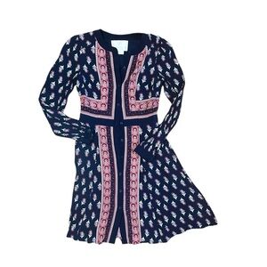Gal Meets Glam Woodblock Print Midi Dress Size 0 Button Up Long Sleeve Blue