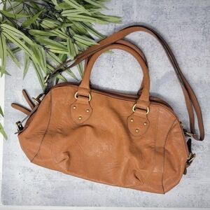 Beautiful cognac tan bag with magnetic button center compartment & two zipper compartments on each side.