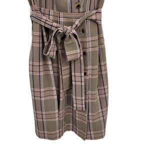 Academia pink purple plaid asymmetrical button down sleeveless square neckline belted pleated knee length pinafore apron Madison Tie Front Dress with pockets by Gal Meets Glam.