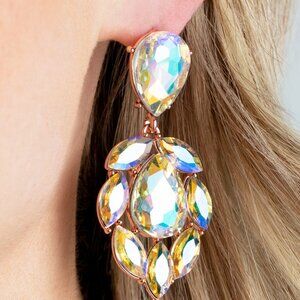 A stellar collection of marquise cut iridescent rhinestones nestle around an oversized teardrop iridescent rhinestone, creating a dramatically stellar display at the bottom of a matching iridescent teardrop rhinestone. Earring attaches to a standard post fitting.