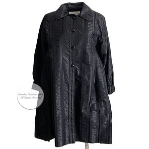 Authentic, preowned, vintage Galanos Rare Swing Coat Black Striped Evening Wear, circa 80s. No content label: silk or silk blend satin. Features voluminous sleeves & wide swing hem. Fully-lined w/shoulder pads & shiny black buttons. Dry clean only. No size tag, fits like M: shoulders - 17.5in, bust - 42in, waist - 48in, sleeves - 24.5in, length - 41.25in. Preowned/vintage w/some signs of wear: some loose threads at the line stitching (hard to see unless looking closely). Sold by Neimans.