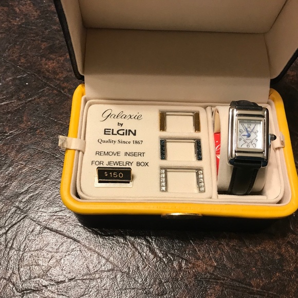 Galaxie by Elgin women’s watch. In original box with three decorative faceplates. Box can be converted into a jewelry box. Watch still has stem pin in. It’s New In Box.