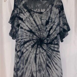 Designed in a relaxed fit with one side cold shoulder with a double strap 4 a unique look on the short sleeve. Washed numerous times to make it extra soft & it is!!! Hand dip dyed with white base & black splash. Body has raw seam detailing on neckband & shoulder band. Clean hemline bottom. So pretty.