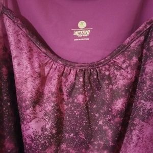 This is a bubble tank top with a built in bra (very very light support). It gathers at the bottom and has a loose fit, perfect for yoga, when you don't want your top to end up in your face in down dog! Only worn once (it just wasn't for me). Made of a substantial fabric.