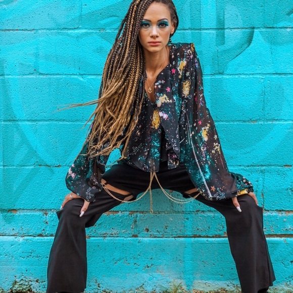 This chiffon blouse is out of this world 🌎 . Unique galaxy print ruffle blouse with full lantern sleeves and tie up waistband. Can be worn as is or layered with another top (like in the first two photos ) or a dress.