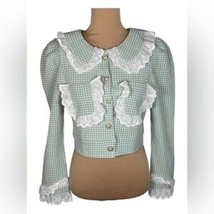 Galeria Chic Green Cropped Gingham Lace Trimmed Women's Top