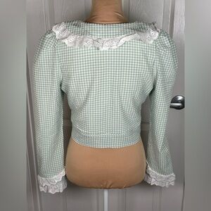 Chic and stylish, this green gingham top features elegant lace trimming. Perfect for adding a touch of vintage charm to your wardrobe.