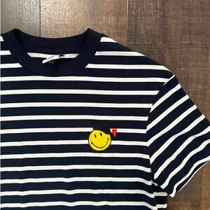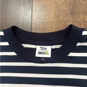 Galeries Lafayette, Smiley Face, Striped Tee, Navy White Shirt, Crew Neck T-Shirt, Casual Top, Graphic Patch Tee, Unisex Style, Streetwear Shirt, Size Medium