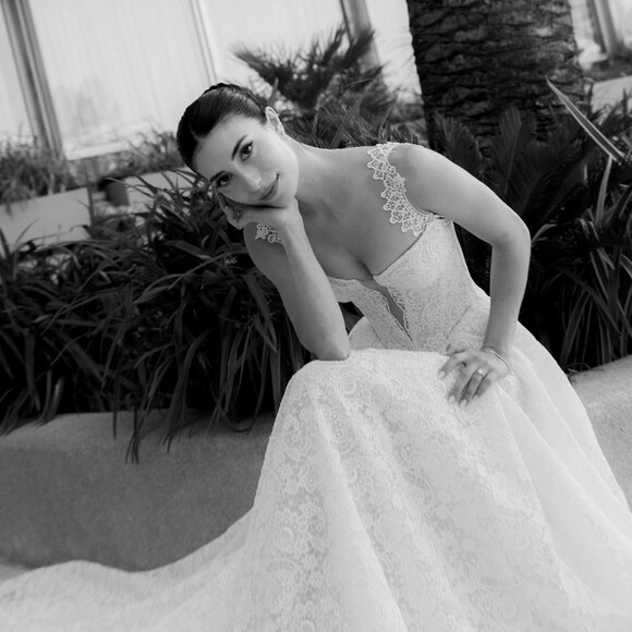 Stunning French guipure lace ball gown featuring a structured corset bodice and dramatic extended cathedral train. Drop waist silhouette with a plunge neckline and signature cat-eye shaped bust cups. Zipper back closure. Fully lined in ivory so it is completely opaque. Worn once and professionally dry cleaned. In excellent condition.