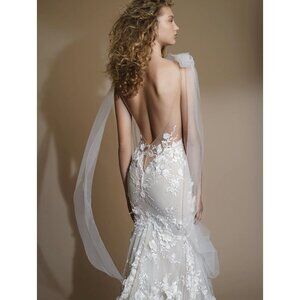 A soft trumpet dress of embroidered lace, blooming with 3D florals in blush and ivory. The draped V-neckline and illusion side panels sculpt the waist, while a sheer back adds a subtle reveal. Tulle shoulder bows add a playful, fairytale touch. The ruched trumpet skirt enhances the bride's shape and flow.