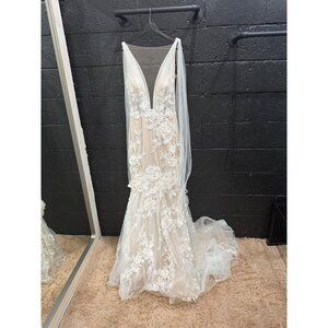 Designed to celebrate the female form, the G-104 features a trumpet silhouette with mid-thigh flare. The skirt flares from mid-thigh into a sweeping train. Removable bows allow optional styling.