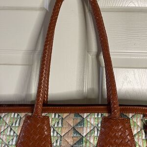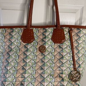 Galian NewYork PVC quilted large tote multi pastel color with brown trim top zipper the inside lining has a side zipper two side pockets pre owned in good used condition normal wear no tear see all pictures any questions please message.G5
