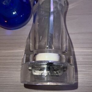 Brilliant blue top and clear pear shaped bottom. Great condition and grinds both salt and d pepper. Can purchase different color tops from Galic.com