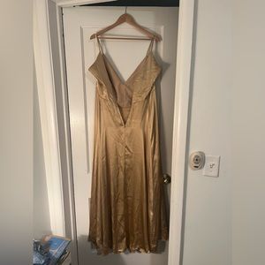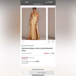 Purchased from David’s Bridal for a wedding I was in Oct 2023. Worn only once. No longer need. Size 20. Perfect to wear for an evening out or formal. I am 5’4” and the dress was just a shy too long for me but it did not drag.