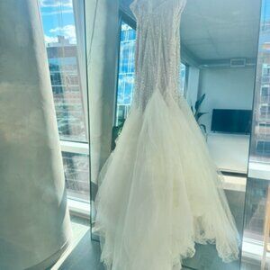 This exquisite Galina Signature wedding dress is everything I dreamed my wedding would be. The moment I slipped into this size 2 mermaid gown, I felt beautiful and confident, ready to say "I do." The sweetheart neckline enhances the bust while the strapless design showcases graceful shoulders, adding a touch of romance to the overall look.