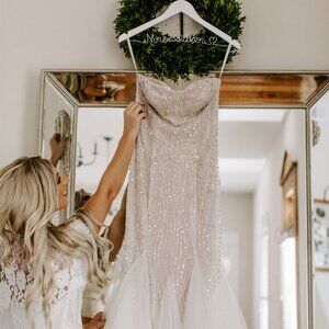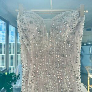 The intricate beading, shimmering crystals, and delicate sequins dance across the fabric, capturing the light in a breathtaking way as you move. The flattering silhouette hugs my curves and flares out at the bottom, creating an elegant and timeless aesthetic. With a mid-back detail that adds just the right amount of allure, this gown is perfect for the bride looking to feel stunning on her big day.