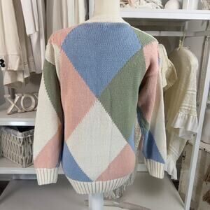 Gallagher hand knitted women's sz small pastel sweater, deep v retro vibe #3047