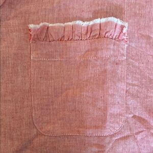 French luxury brand Gallego Desportes Orange Linen blend Button-Up relaxed fit, Untuckable shirt with stand Up collar, 3/4 Sleeve and a drop shoulder. Front pocket has fringed detail for elevated look.