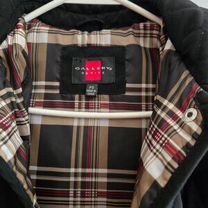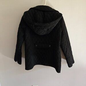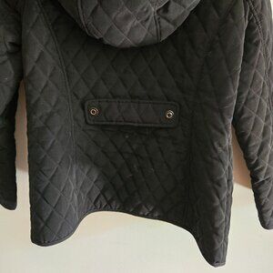 Nice Looking Black Quilted Jacket with 2 front pockets, and snap closures. Removable Hood.