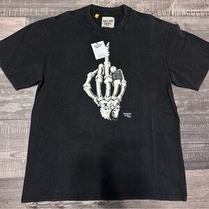 Black short sleeve tee with gold skeleton hand graphic. Bold Gallery Dept logo.