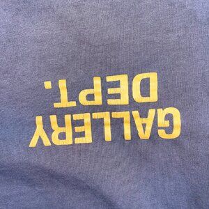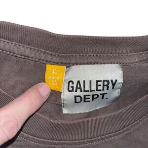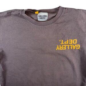 This crewneck t-shirt by Gallery Dept. features a minimalist design with a bold yellow logo on a brown backdrop. Made in the USA, it combines quality craftsmanship with casual style, suitable for various settings.
