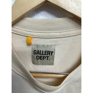 The Gallery Dept. Tokyo Japan Men's Cream Vanilla Paint Splattered T-Shirt in size S is a stylish and unique piece of clothing for men. This short sleeve T-shirt features a beige color with paint splatter accents, giving it a trendy and artistic look. Made by Gallery Dept., this regular fit shirt is designed for a comfortable and flattering fit. Perfect for adding a touch of personality and individuality to any outfit, this T-shirt is sure to make a statement for those who appreciate a blend of streetwear and high-end fashion.