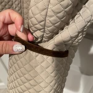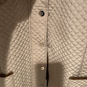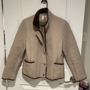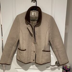 Coat jacket quilty velvet accents in brown zipper and buttons hidden pocket inside.