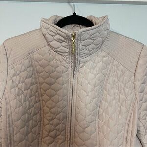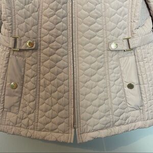 Gallery lighter weight quilted pattern beige jacket 100% polyester, full zip front, 2 front pockets and 1 interior pocket. Tailored fit with beautiful gold accents throughout. Goldtone accents have minor scratches on them( refer to photos) . There is a slight mark on the right side of the collar. Please refer to last two photos. Thank you. This is a very popular style! This is a perfect color jacket for fall ! Size Small Measurements are pit to pit 19 1/2” length 25 1/2” sleeve 24 1/4”