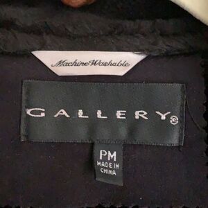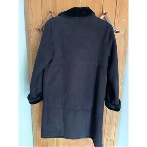 Gallery black faux suede long overcoat with black fur trim on collar and sleeve cuffs. Deep front pockets and lined with faux fur. Cuffs can roll up our down. Buttoned front closure. Excellent Condition