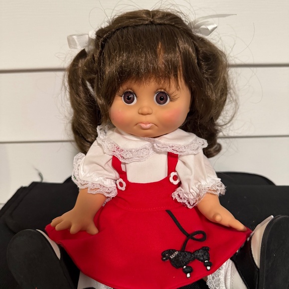 Galoob Custom Baby Face “Endearing Eloise” made from “So Sorry Sarah”. She has been washed, hair cut and Monique wig applied, new brown eye chips placed, new eyelashes put on, restrung, dressed in her poodle outfit (made by Linda Dunmore) with saddle oxfords and ruffled socks. No props included. No other dolls included (only featured doll)