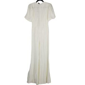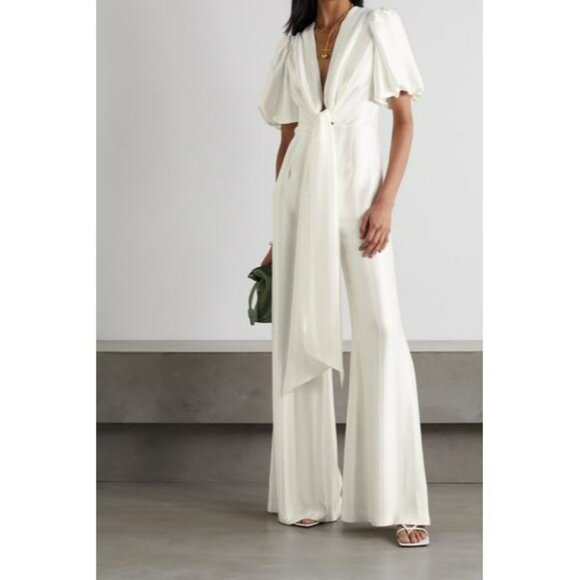 Galvan London Eden Plunging Wide Leg White Satin Bridal Jumpsuit Puff Sleeve NWT New