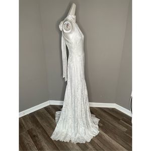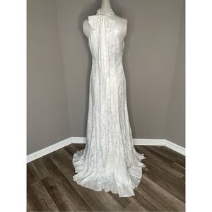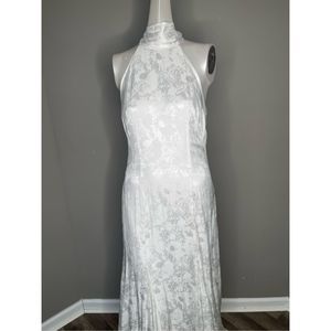 Elegant halter gown with a soft silk-blend boasts a soft floral pattern in a subtle design.