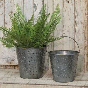 Galvanized Metal Punched Buckets are sold as a set of two galvanized metal buckets with a punched hole, grater-like design. Use to dress up a faux plant in an undesirable planter, roll up towels and place in the bathroom as a fun storage option, or use to hold remote controls so they never get lost again! Each bucket includes a carrying handle. The smaller size measures 6" high by 6.5" in diameter. The larger size is 6.75" high by 7" in diameter.