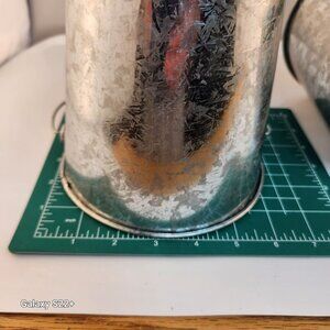 These galvanized tin buckets combine rustic charm and practical design, suitable for decor or utility. The wooden handles ensure easy handling and transport.