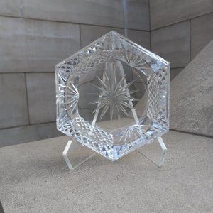 This ashtray (catchall) was made by Galway Crystal of Ireland. Its design is traditional classic. It is Hexagonal in shape, with three cigarette wells. Composed of approximately 2.5 pounds of leaded cut crystal. it features a 16 point star on its bottom at center. The top rim of approximately 1/2" is plain and unadorned. a drop level of 1/2" ids similarly unadorned, and extends the diameter of the catchall. below that and spanning to the bottom are six panels with alternating designs, three with waffle, criss cross cuts and three with pineapple upward reaching rays cuts.