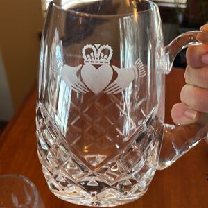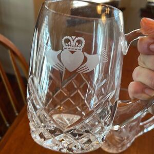 This crystal tankard has an Irish Claddagh etched into the side. Makes a unique and wonderful gift. Measures approx. 5.5 inches high.