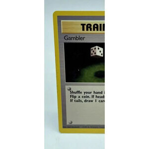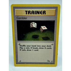 This Gambler card from the Fossil set of the Pokémon Trading Card Game is a vintage, non-holo collectible card. It features the character Gambler and is made of card stock with a regular finish. The card number is 60/62 and it was manufactured by Nintendo in 1999. The card is in English and illustrations were done by Keiji Kinebuchi. This card is a great addition to any collection for fans of the Pokémon TCG or collectors of vintage cards.