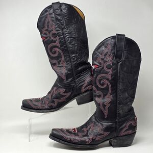 Stylish black cowboy boots featuring intricate red embroidery. Perfect for adding a bold touch to any outfit.
