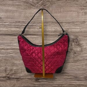 STYLE: Quilted shoulder bag with black faux leather trim and single strap. The quilting gives it a stylish, puffy texture.